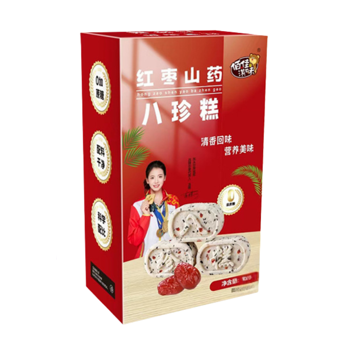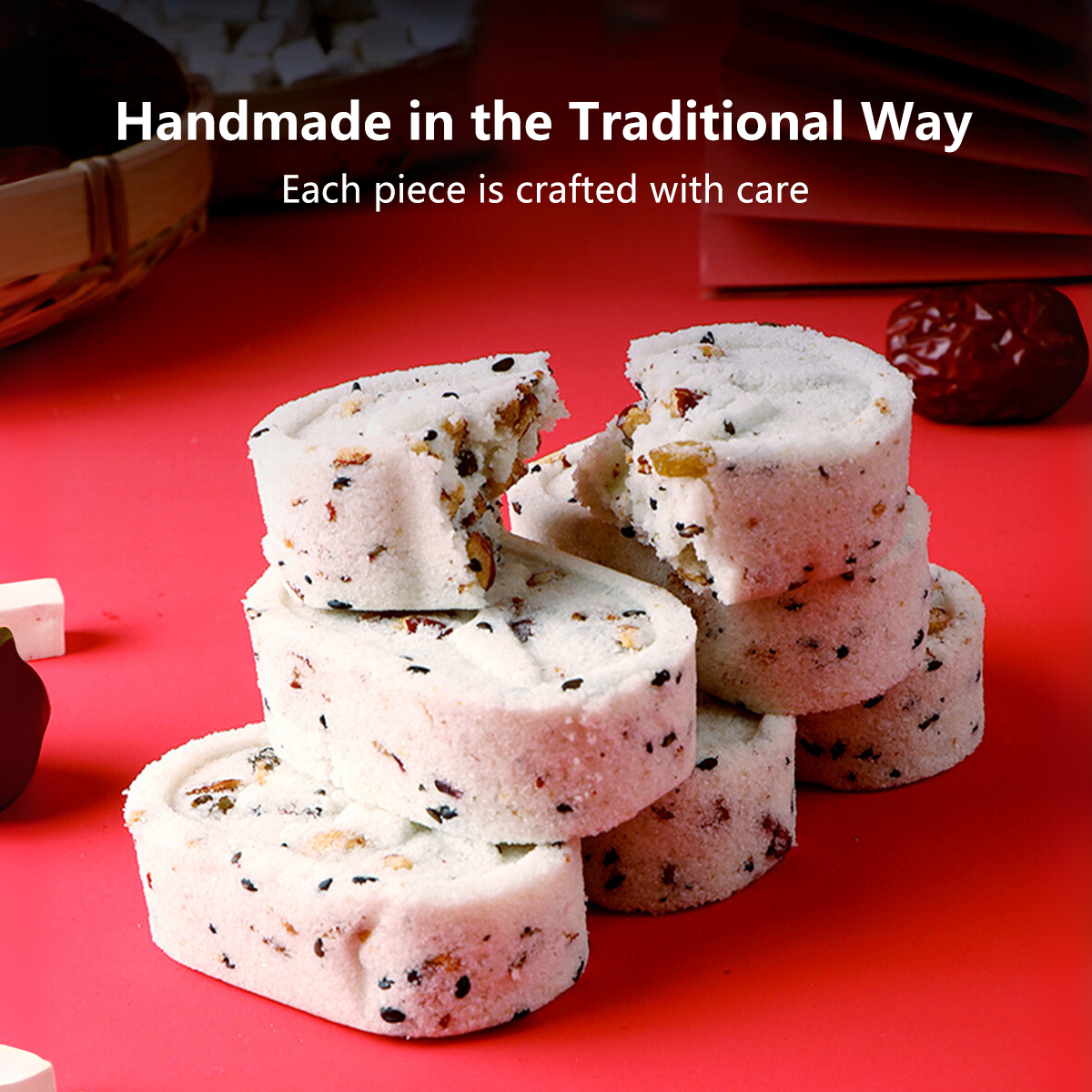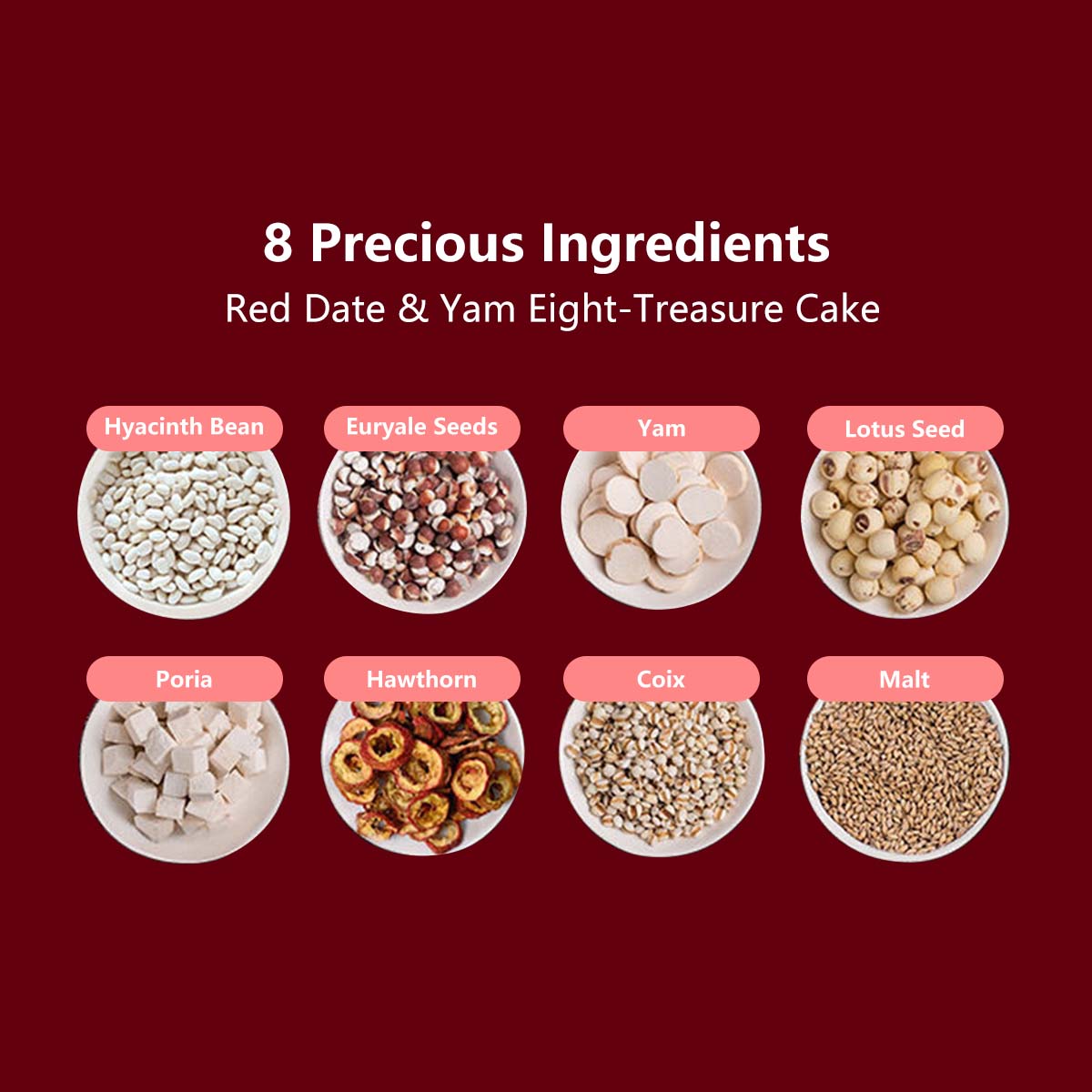 π Ingredients: Glutinous Rice Flour, Rice Flour, Eight-Treasure Powder >20% (Poria, Gorgon Fruit, Lotus Seeds, Coix Seeds, Hawthorn, Chinese Yam >6%, Hyacinth Bean, Malt), Maltose, Red Date Pieces >12%, Raisins >4%, Trehalose, Black Sesame >3%, Candied Cranberries >2%, Lotus Seed Paste, Sorbitol Syrup, Edible Vegetable Oil, Potassium Sorbate.