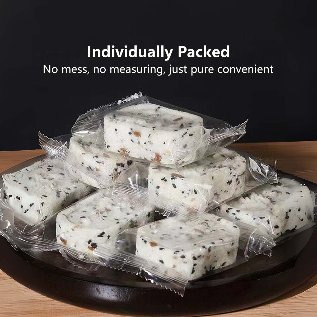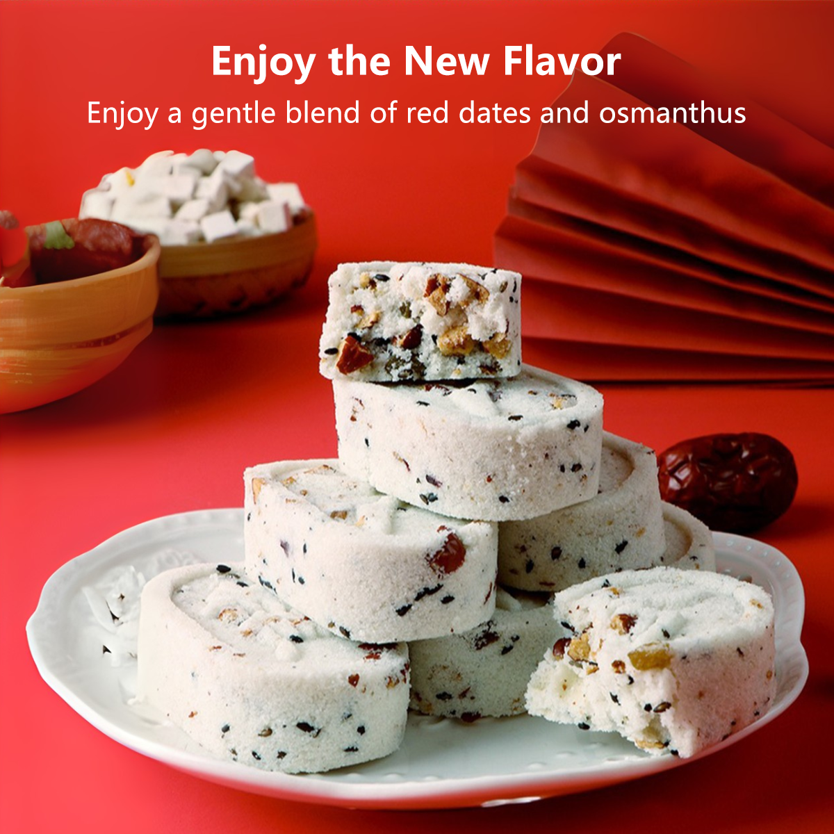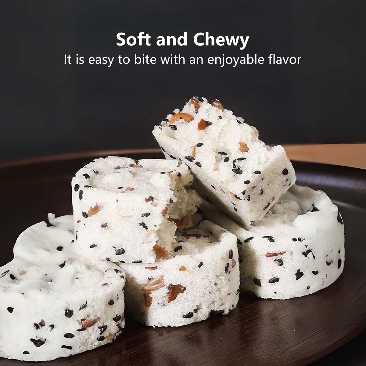 π Ingredients: Glutinous Rice Flour, Rice Flour, Eight-Treasure Powder >20% (Poria, Gorgon Fruit, Lotus Seeds, Coix Seeds, Hawthorn, Chinese Yam >6%, Hyacinth Bean, Malt), Maltose, Red Date Pieces >12%, Raisins >4%, Trehalose, Black Sesame >3%, Candied Cranberries >2%, Lotus Seed Paste, Sorbitol Syrup, Edible Vegetable Oil, Potassium Sorbate.