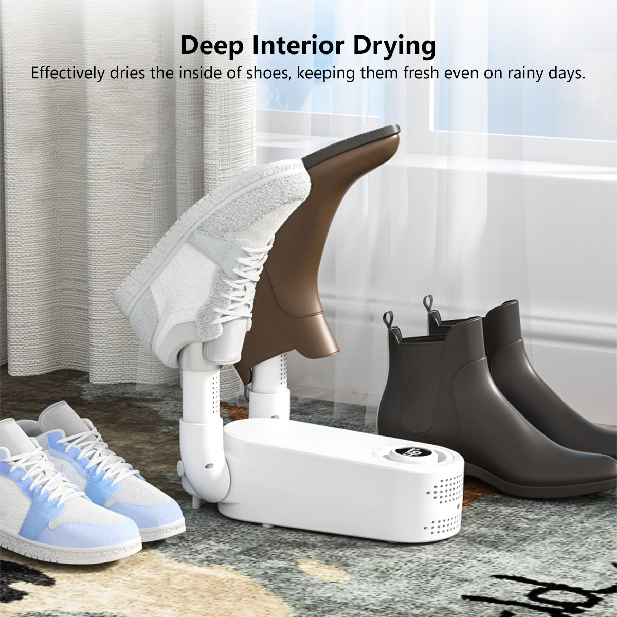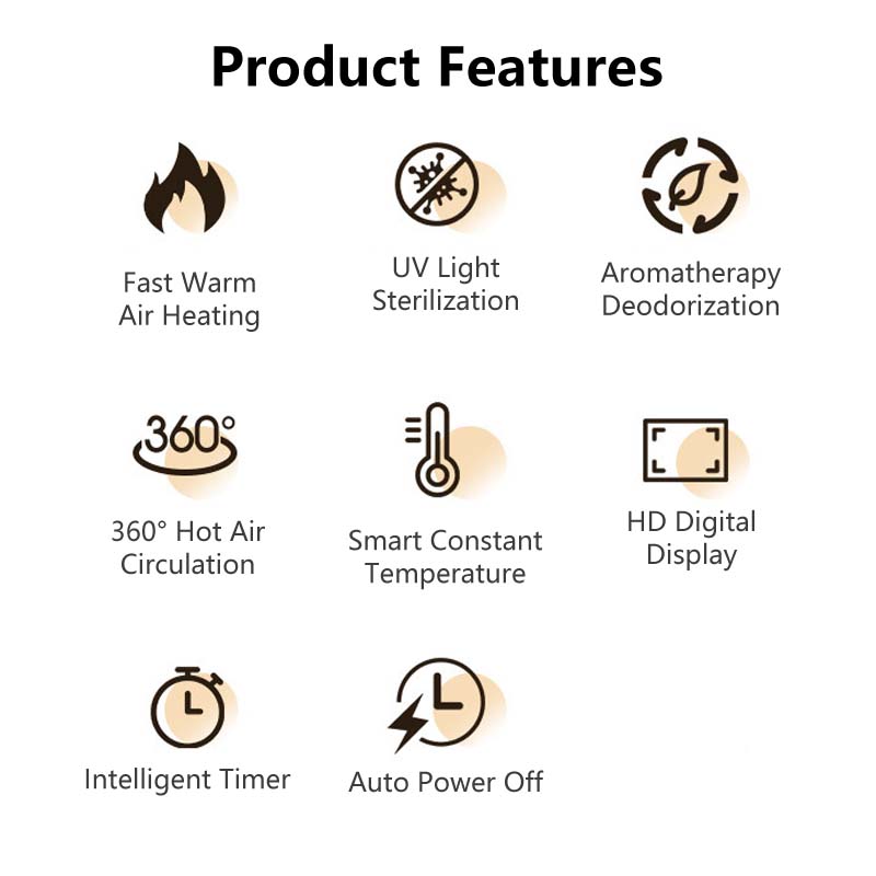 👉 Functions: Dries socks, shoes, boots, and gloves; deodorizes and sterilizes; intelligent timer; overheat protection