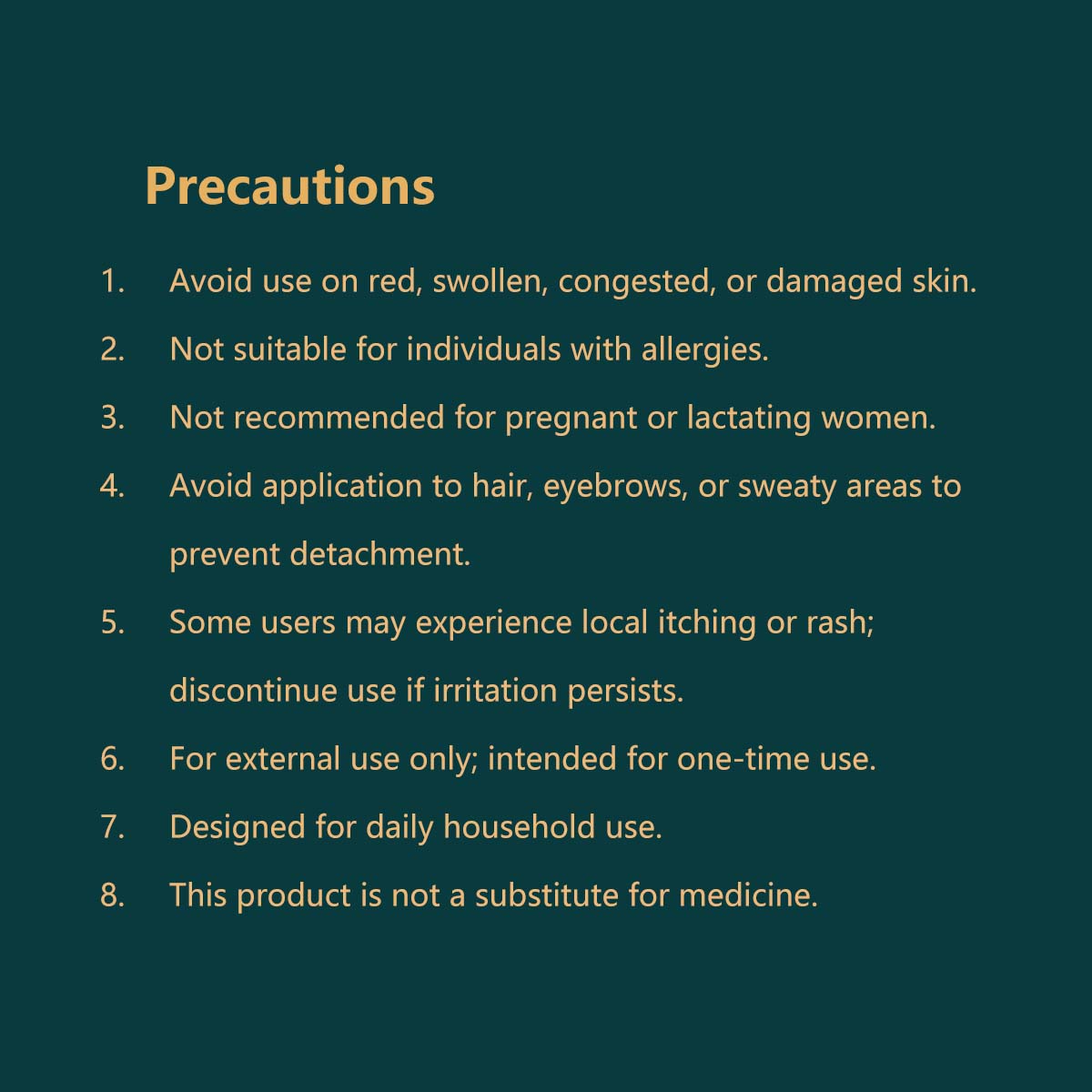 4. Avoid application to hair, eyebrows, or sweaty areas to prevent detachment.
